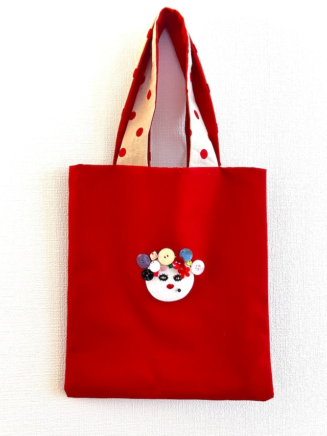 手作り布バッグ。赤のコットンを基本に刺繍や手作り包みボタンなどで飾りました。 素材:コットン、ボタン。 サイズ:横27cm×縦32cm(持ち手は含まず)、持ち手19cm。 A4サイズの物収納出来ます。