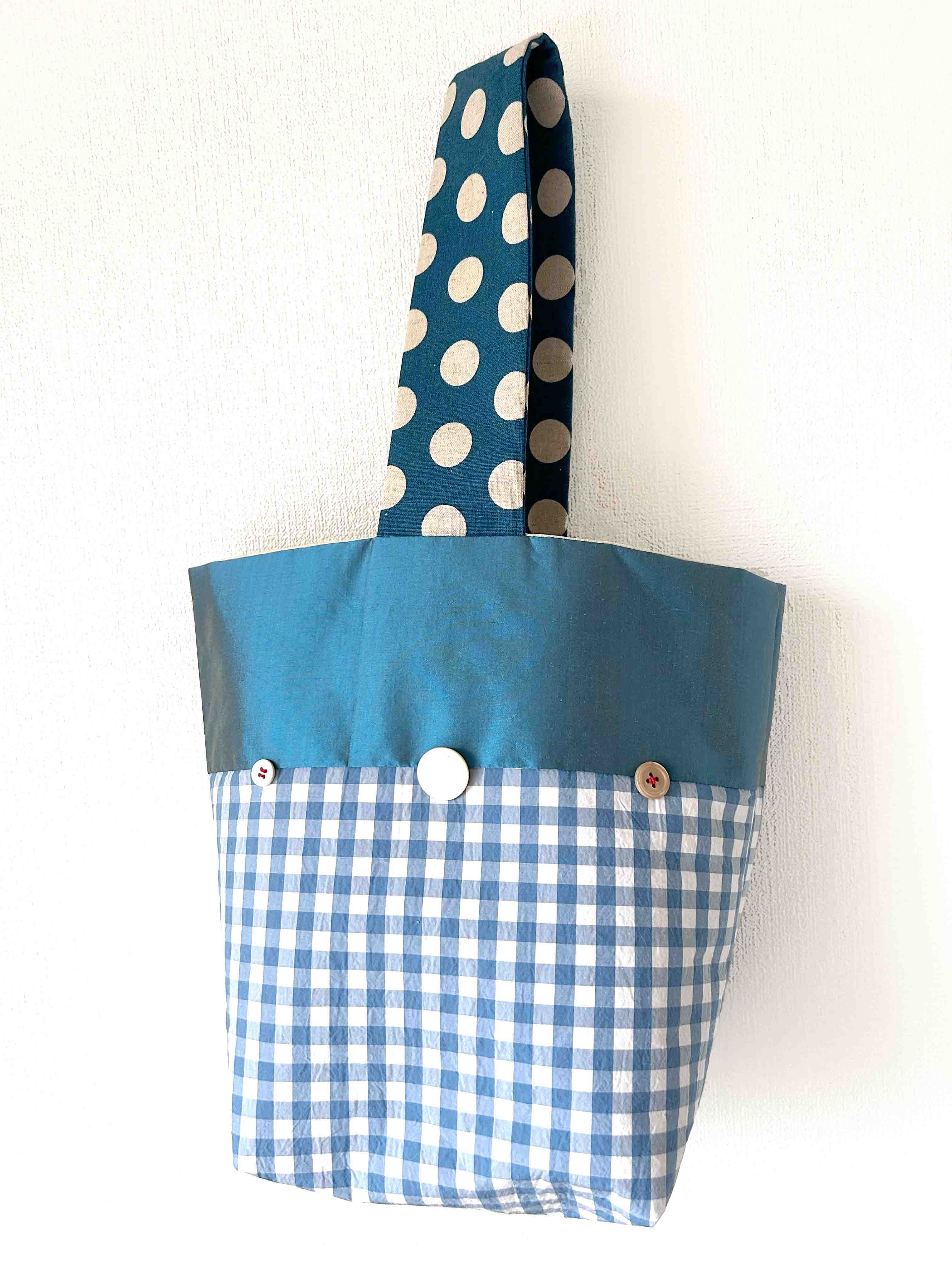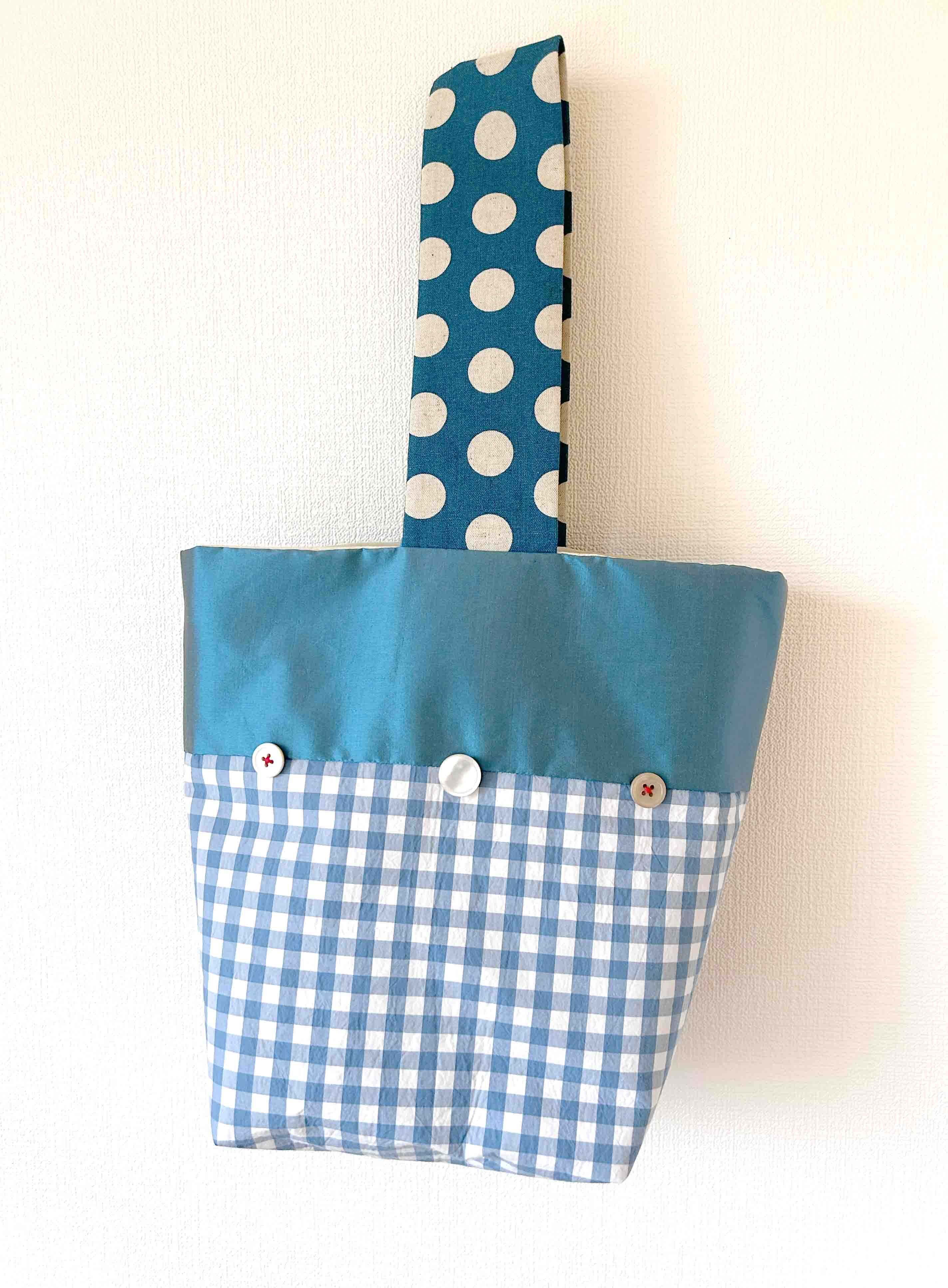 手作り布バッグ。コットンとシルクなどで作ったバケット型。