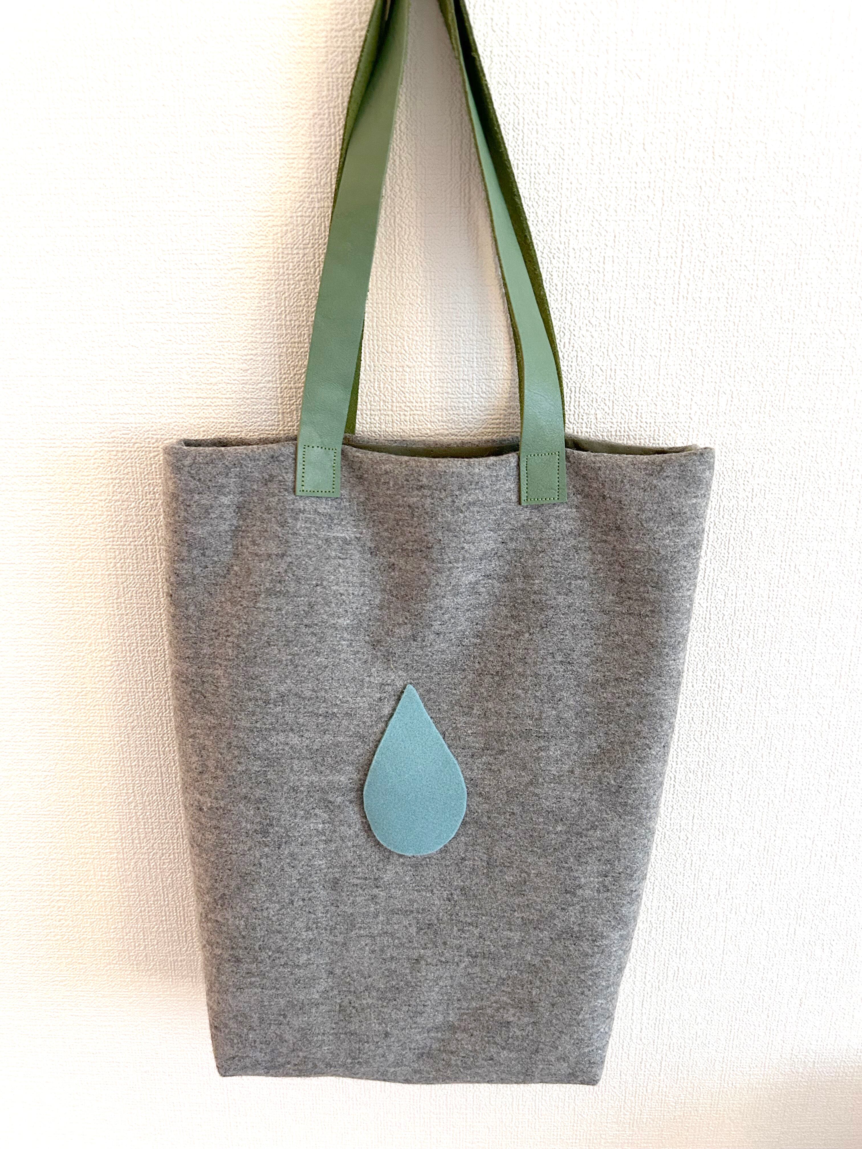 手作り布バッグ。グレーンのウールに雫の形をアップリケ表はゆらゆらと雫が揺れる。