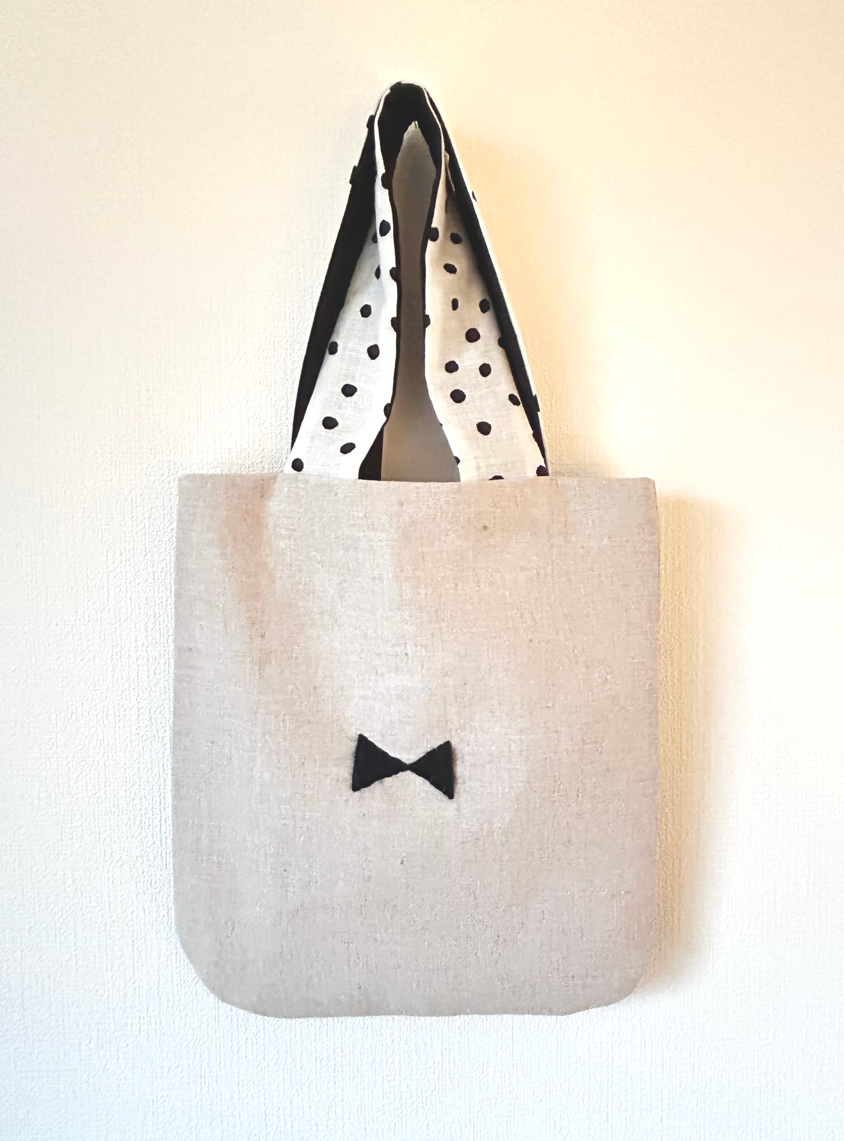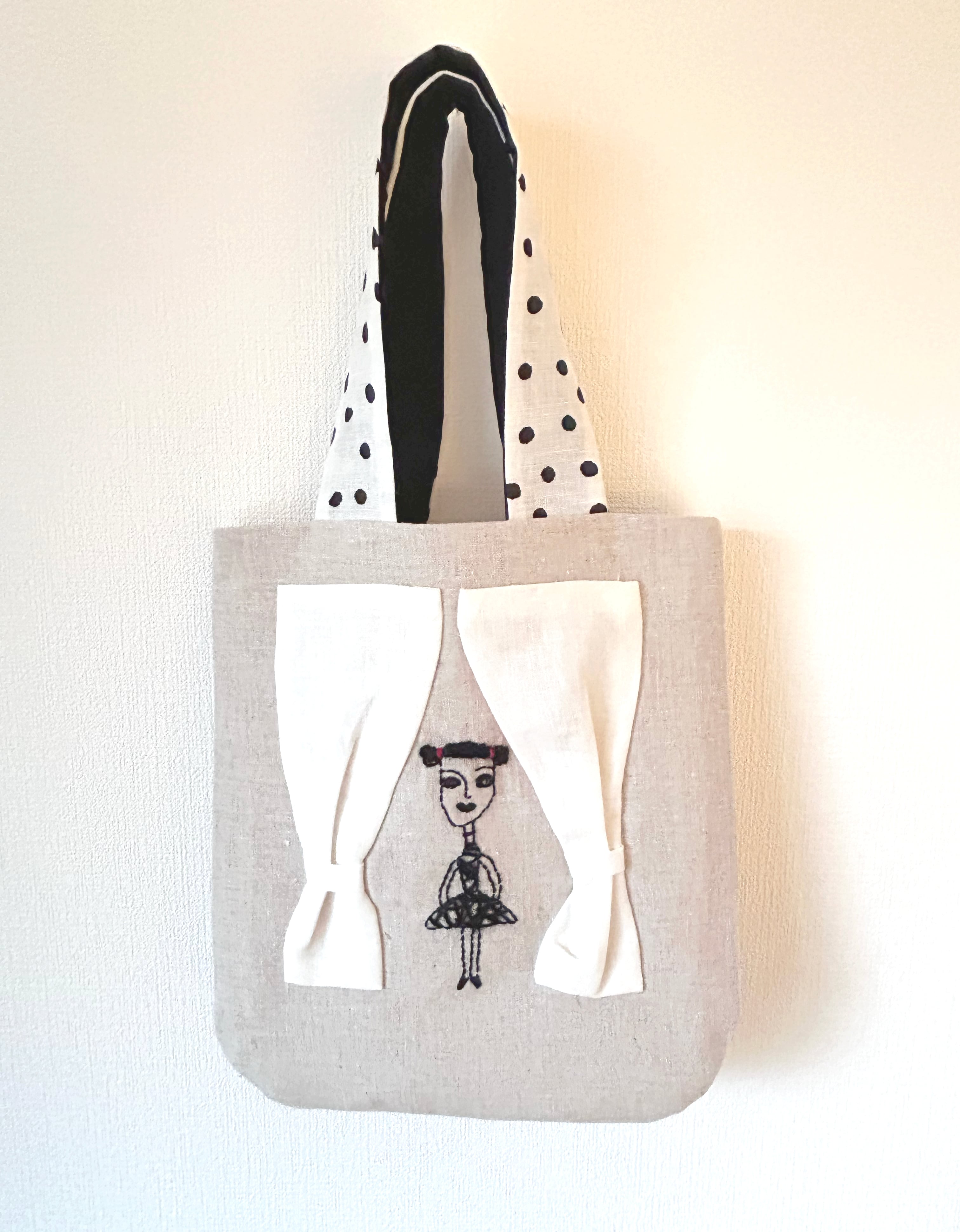 手作り布バッグ。麻布に古村耀子のイラストを刺繍。